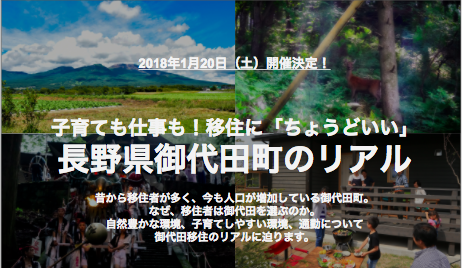 軽井沢・御代田町の移住イベント 【御代田町主催トークイベント】子育ても仕事も!移住に「ちょうどいい」長野県御代田町のリアル 2017年12月14日 ご応募を締め切りました 子育ても仕事も!移住に「ちょうどいい」 長野県御代田町のリアル 昔から移住者が多く、今も人口が増加している御代田町。 なぜ、移住者は御代田を選ぶのか。 子育てしやすい自然豊かな環境、穏やかな気候、... リグプラス編集部 もっと見る