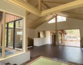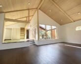 玄関を開けると、奥へ奥へと広がる空間にびっくり。三角天井が可愛らしいリビングは、30畳の広さがあります。左右大きく窓をとってあり、とても明るい雰囲気です。リビングと居室の間にはなんと中庭があります。山野草が似合いそうな静かな雰囲気で、ガーデニングも一層楽しみが増しそうです。