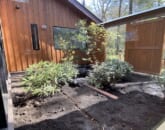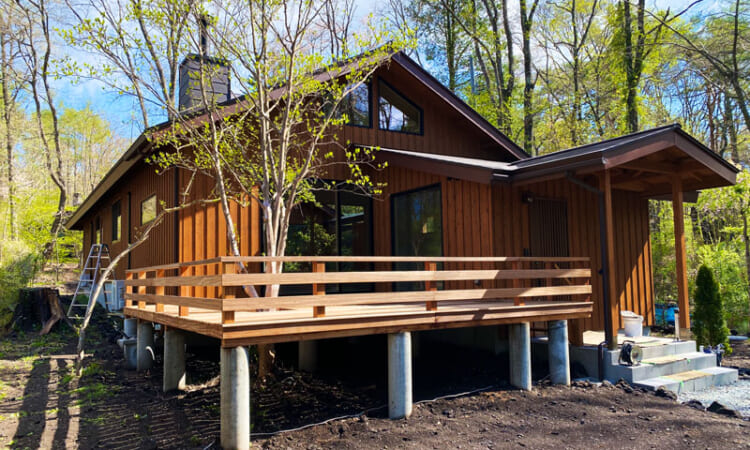 一見ログハウスのような、木の雰囲気が素敵な一軒家。林の中に佇み、玄関横の広いデッキが印象的です。緑の時期にはハンモックやBBQコンロを出して素敵な休日を。紅葉の時期はのんびりクッションを抱えながら読書もいいかもしれません。