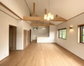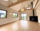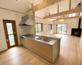 大きな吹き抜け、床暖房に薪ストーブ。高い位置にある窓からはたっぷり日差しが入り、快適な空間が広がります。対面キッチンはカウンターがあり、料理をしながらのおしゃべりも弾みそう。キッチン横の扉から洗面脱衣所へと動線が続き、家事がしやすい間取りもポイントです。子ども部屋に二部屋使い、主寝室をとってももう一部屋のこる4LDK。ゲストルームや書斎、趣味の部屋など、用途もいろいろ考えられそうです。