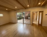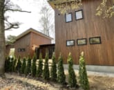 外観もさることながら、一歩室内に踏み入れても温かみのある木を取り入れたデザインが印象的です。木製の階段を上ると、コンパクトな2つの居室があり、それぞれの窓からは美しい緑が借景として飛び込んできます。新緑から紅葉、そして冬の雪景色までまるで絵画のように移ろいゆく自然を愛でながら過ごすことが出来るでしょう。緑が多い環境なので、時にはデジタルリセットをして鳥のさえずりや虫の音など、自然の音に耳を澄ませて過ごしてみるのも良いですね。