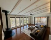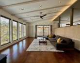 冬の寒さが厳しい軽井沢。こちらの建物には断熱材として発泡ウレタンを使用し、隙間のない断熱層を形成し、室内に気密工事を施工することで、高い断熱性を実現しています。特に開口部である窓は、高い断熱性を維持するために、木製フレームサッシと遮熱タイプの「Low‐Eペアガラス」を採用しています。もちろん、夏場の避暑としての利用にも良いですが、薪ストーブと、温水式パネルヒーターも導入されているため、冬でも暖かく、快適に過ごすことができます。