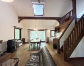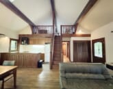そこは未舗装の道が続く緑の林のなか。木漏れ日に誘われて進んだ先にある本物件は「これぞ軽井沢!」と心躍る素敵なたたずまい。ある程度の年数を経たからこその重厚感と温もりを感じさせる外観、アイアンを使った装飾や広いウッドデッキ、重厚感のある梁、三角屋根の形状を活かしたロフトスペース、大きな吹き抜けと使い勝手の良さそうなキッチンと、建物は真の快適性と美しさを備えたドイツハウス施工です。その道の職人の手で丁寧に造られ、四季を通じて快適に過ごせる高気密・高断熱構造、そして自然素材の心地よさが見事に調和しています。さらに奥には和室も備え、蒸し暑い夏にはゴロリと寝転がってホッと一息。邸宅内全体に漂うあたたかな趣きは、この家が永く愛され、大切に使われてきたことを穏やかに物語ります。