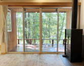 豊かな木々に囲まれた環境に佇む平屋建ての住まい。お庭には大きなナラを中心に様々な広葉樹や草花が生い茂り、四季折々の豊かな緑を楽しむことができ、春には芽吹き、夏には濃い木陰、秋には色づいた紅葉、冬には薪ストーブの炎と窓から差し込む陽の光が暮らしを温めます。室内に足を踏み入れると、木の温もりがあふれる開放的な空間が広がります。南に面した大きな窓からは木漏れ陽が降り注ぎ、リビングとウッドデッキを一体に感じられる設計。隣地とは高低差があることで、窓からの目線が重ならず、プライベート感の高い暮らしが叶います。吹き抜けの天井は空間をさらに広く、伸びやかに演出し、家族の会話や来客とのひとときをより心地よいものにしてくれます。リビングの中心には存在感のある薪ストーブ。寒い冬には、炎の揺らめきと共に身体が芯から温まり、特別な憩いの時間を与えてくれます。