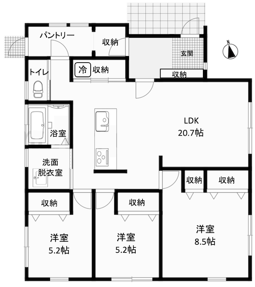 20帖の広々としたLDKを中心に、洋室3部屋バランスよく配置され、家族構成に柔軟に対応できる間取り。LDKは開放感のある空間で、キッチンからはリビング・ダイニング全体を見渡すことができ、日々の家事やご家族とのコミュニケーションもスムーズ。各居室はそれぞれ独立性があり、寝室・子供部屋・書斎など用途に応じて使い分けが可能です。玄関から続くパントリーとSIC(シューズインクローゼット)を備え、収納力も充実。食品ストックやアウトドア用品、季節物の収納にも便利で、室内をすっきり保つことができます。水回りは一箇所に集約されており、生活動線にも配慮された設計のお家です。また、建物仕様は耐震等級3の地震に備えた安心構造。寒冷地仕様で冬も快適に過ごせる、将来を見据えた安心の住まいとなっています。