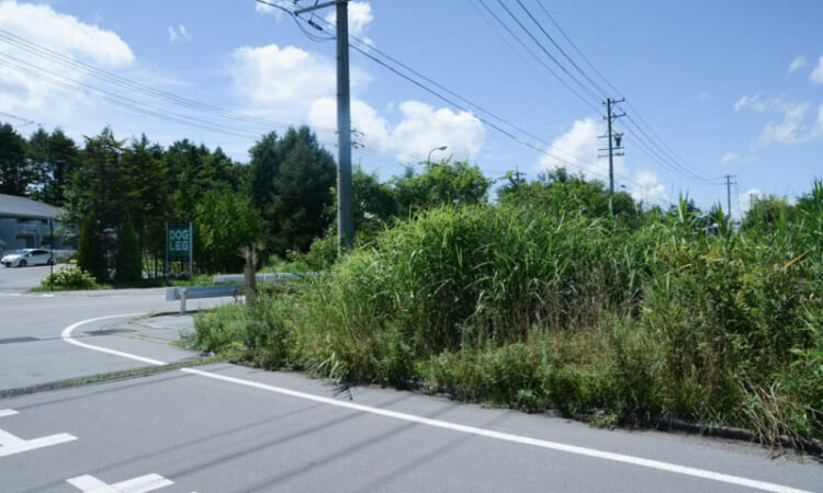 今回は、車通りがよく店舗向きの区画をご紹介。位置は、南軽井沢の中でも北の端。アウトレット「プリンス・ショッピングプラザ」の裏手のあたりです。目の前はバイパスという好立地でとにかくアクセスが便利です。実際に車通りは絶えず、店舗には条件のいい場所。敷地も広く駐車場を大きくとることができます。