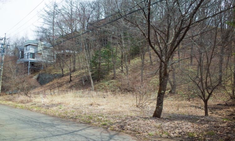 土地は、約490坪とかなり広めですが、メイン道路側が平坦地、奥が傾斜地に分かれた特徴的な形。平坦部分だけでも十分な広さですが、ここは傾斜もうまく活かしたい。こちらは木々が生い茂り、その隙間からは、手前にはローズガーデン、その先には浅間山と、セットで眺めを堪能できます。