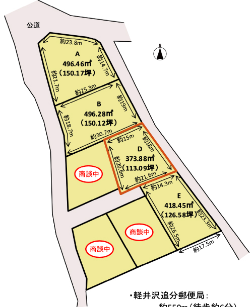 分譲地の南側には畑が広がり、景観が抜けているため見晴らしがよく、空も広く感じます。この土地は、7軒の分譲地のうちややコンパクトですが、それでも広さは113坪と十分な広さがあります。南側に向けて広くなる台形の土地をどう生かすかがポイント。広めの南側に庭を作れば十分な日差しを家の中まで取り込めそうです。また、こちらは建築条件付きの土地なので、地元の設計士さんと相談しながら家を作るのが楽しみでもあります。この土地の環境などを熟知した地元の建築会社さんとタッグを組むことで、自分たちらしく、そして、この土地らしい家づくりができること間違いなしです。